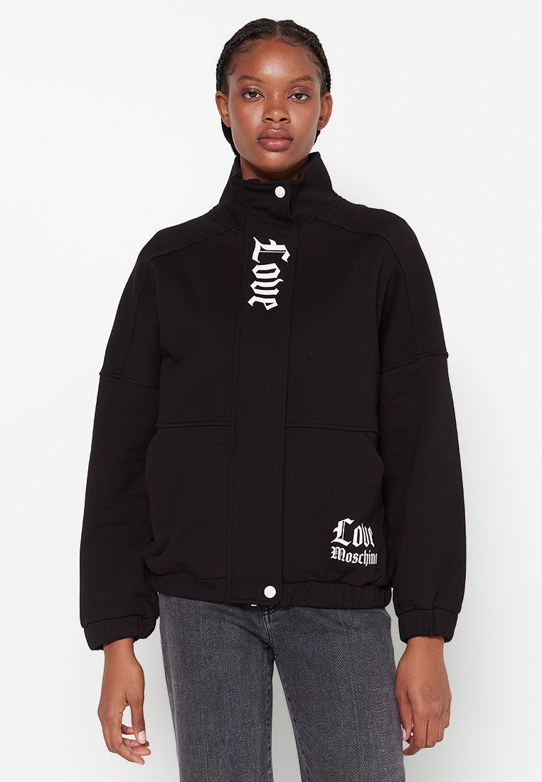 Stay cozy and stylish this Autumn/Winter season with the Love Moschino Casual Hoodie for Women. This black zip-up hoodie is perfect for layering and adding a chic touch to any outfit. Made with quality materials, it's a must-have for staying warm and fashionable on chilly days. Upgrade your wardrobe with this versatile and trendy Felpa Con Zip.