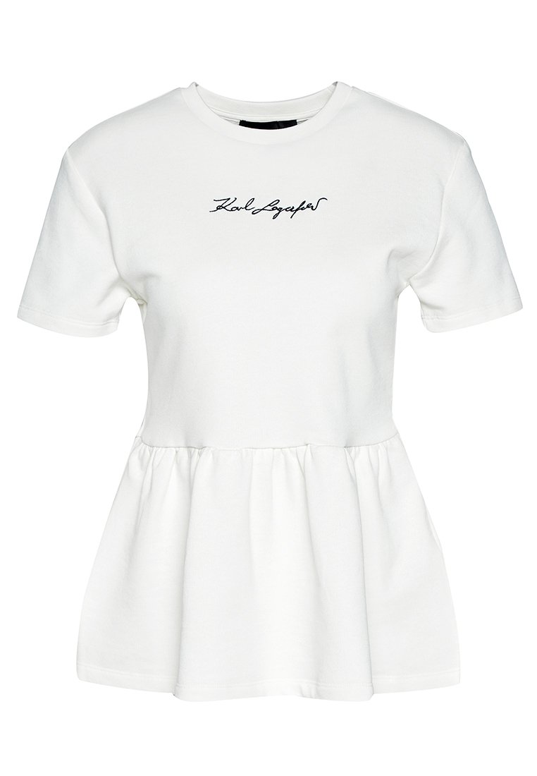 Stay effortlessly chic in this Karl Lagerfeld Women's Casual T-Shirt for the Spring/Summer season. Crafted in crisp white, this basic tee is perfect for everyday wear. With its relaxed fit and subtle logo detail, it's a must-have staple for any wardrobe. Elevate your casual style with this classic piece.