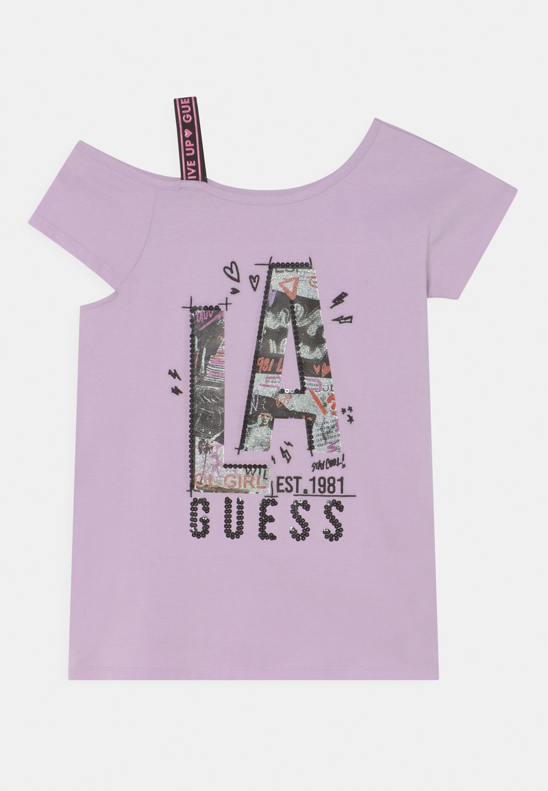 Stay cool and stylish this Spring/Summer with the women's casual Guess T-shirt in a vibrant violet hue. This trendy tee features a unique print that adds a touch of fun to any outfit. Perfect for pairing with jeans or shorts for a laid-back yet chic look. Upgrade your wardrobe with this must-have t-shirt for the warmer months ahead.
