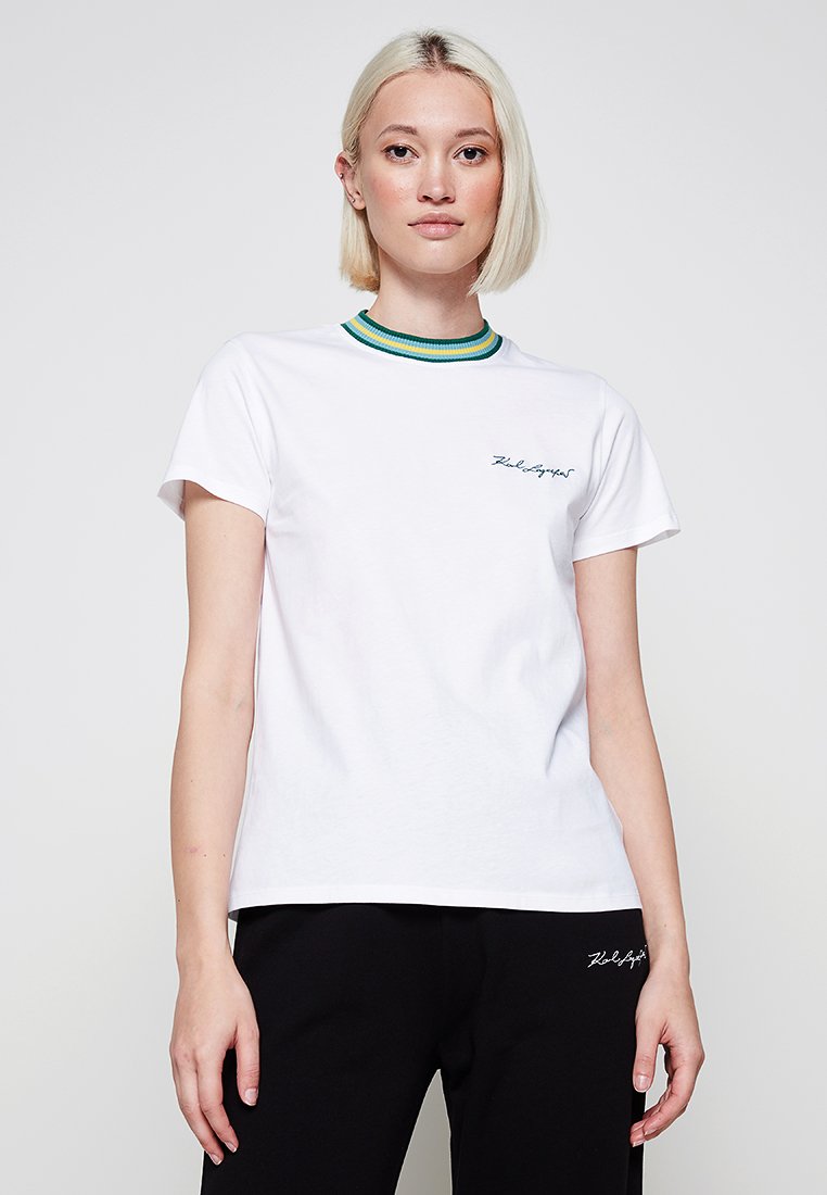 Stay effortlessly chic in this Karl Lagerfeld Women's Casual Style T-shirt for the Spring/Summer season. Crafted in a crisp white color, this tee features a stylish print that adds a touch of flair to any outfit. Perfect for a relaxed yet fashionable look on sunny days.