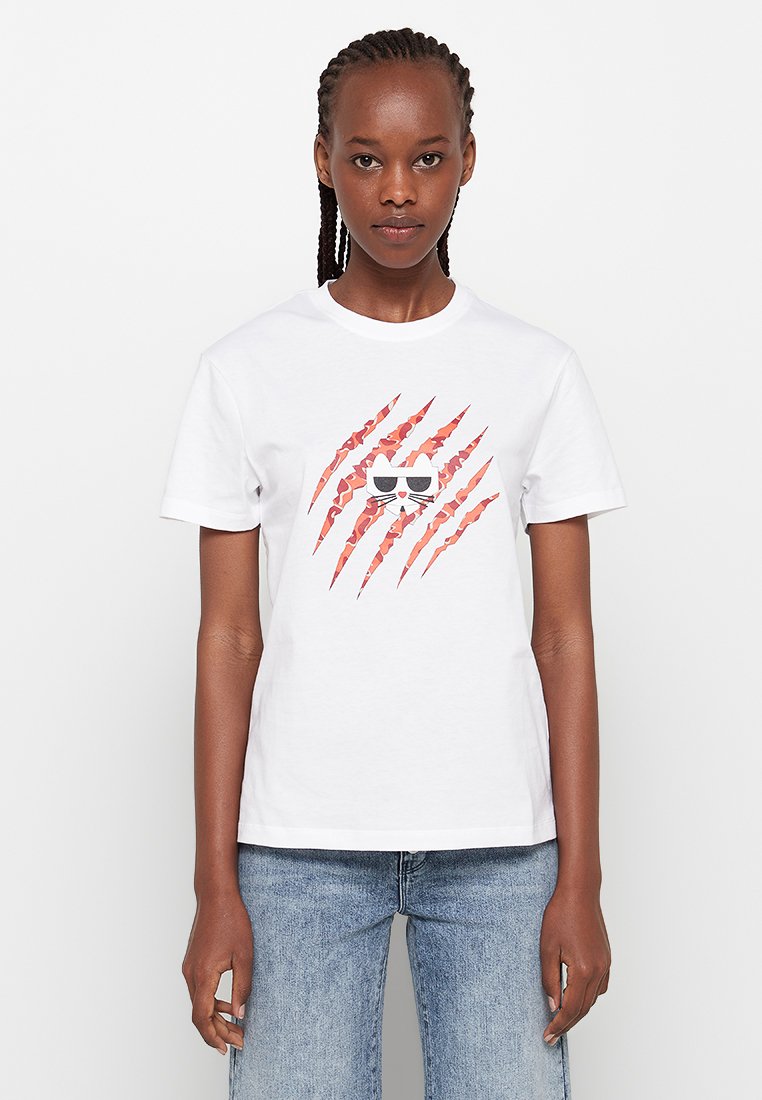 Stay effortlessly chic in this Karl Lagerfeld Women's Casual Style T-shirt for the Spring/Summer season. Crafted in a crisp white color, this tee features a stylish print that adds a touch of flair to any outfit. Perfect for a relaxed yet fashionable look on sunny days.