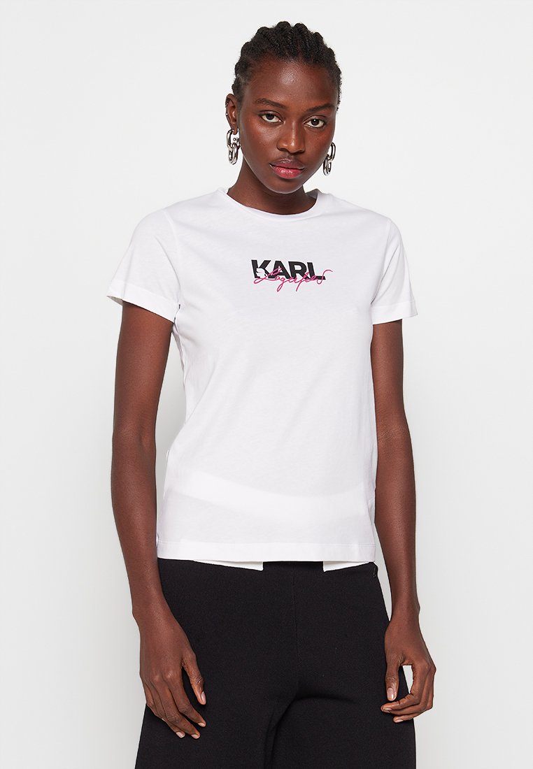 Stay effortlessly chic in this Karl Lagerfeld Women's Casual Style T-shirt for the Spring/Summer season. Crafted in a crisp white color, this tee features a stylish print that adds a touch of flair to any outfit. Perfect for a relaxed yet fashionable look on sunny days.