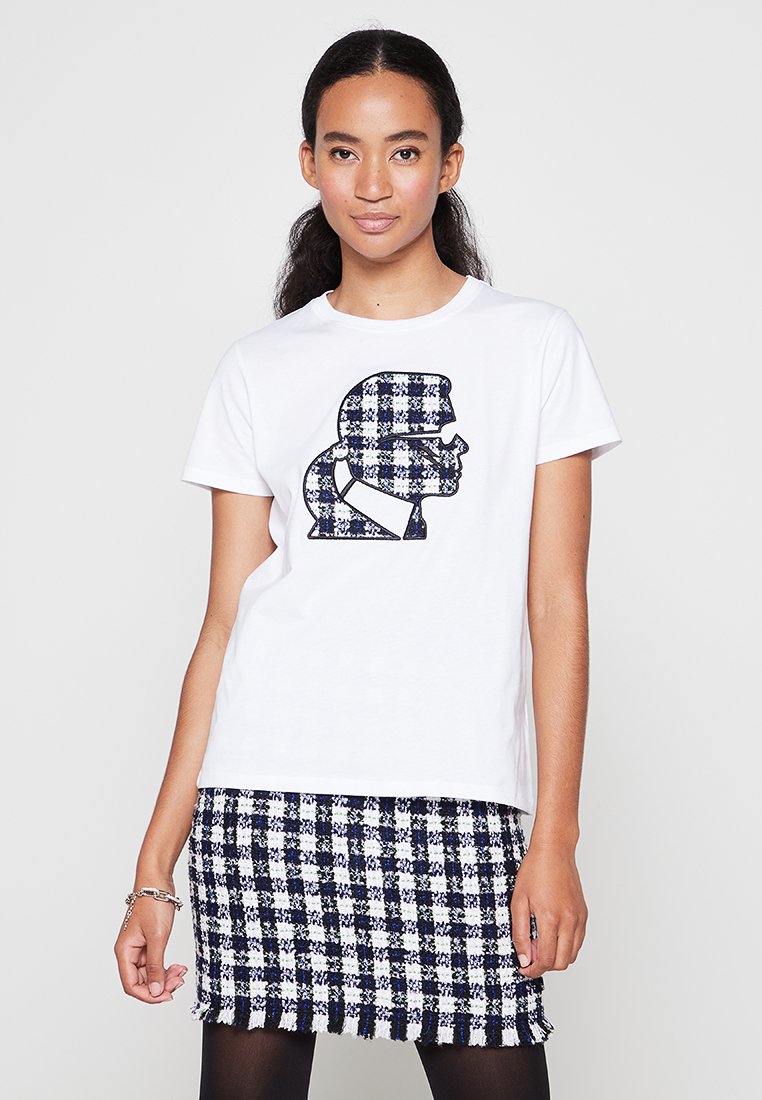 Stay effortlessly chic in this Karl Lagerfeld Women's Casual Style T-shirt for the Spring/Summer season. Crafted in a crisp white color, this tee features a stylish print that adds a touch of flair to any outfit. Perfect for a relaxed yet fashionable look on sunny days.
