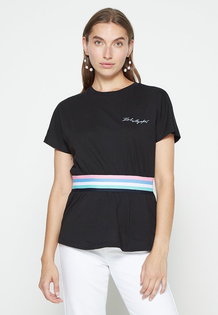 Stay effortlessly chic in this Karl Lagerfeld Women's Casual T-Shirt for the Spring/Summer season. Designed in classic black, this tee features a stylish print that adds a touch of flair to any outfit. Perfect for pairing with jeans or shorts, it's the must-have addition to your casual wardrobe. Elevate your style with this versatile t-shirt.