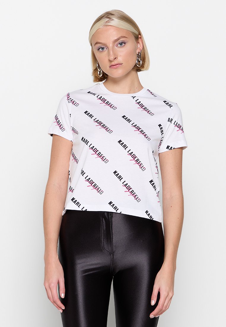 Stay effortlessly chic in this Karl Lagerfeld Women's Casual Style T-shirt for the Spring/Summer season. Crafted in a crisp white color, this tee features a stylish print that adds a touch of flair to any outfit. Perfect for a relaxed yet fashionable look on sunny days.