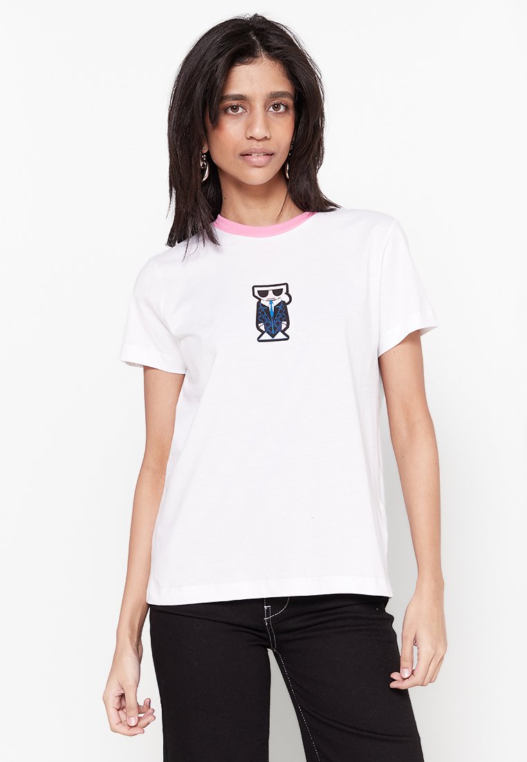 Stay effortlessly chic in this Karl Lagerfeld Women's Casual Style T-shirt for the Spring/Summer season. Crafted in a crisp white color, this tee features a stylish print that adds a touch of flair to any outfit. Perfect for a relaxed yet fashionable look on sunny days.