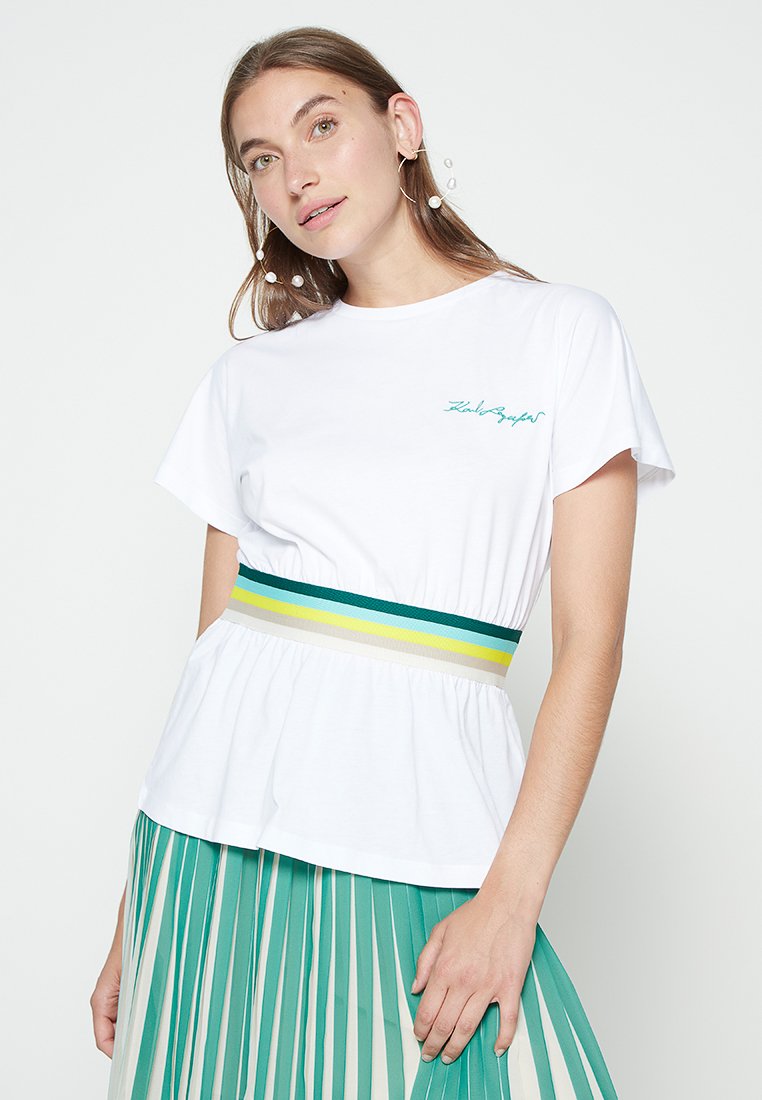 Stay effortlessly chic in this Karl Lagerfeld Women's Casual Style T-shirt for the Spring/Summer season. Crafted in a crisp white color, this tee features a stylish print that adds a touch of flair to any outfit. Perfect for a relaxed yet fashionable look on sunny days.