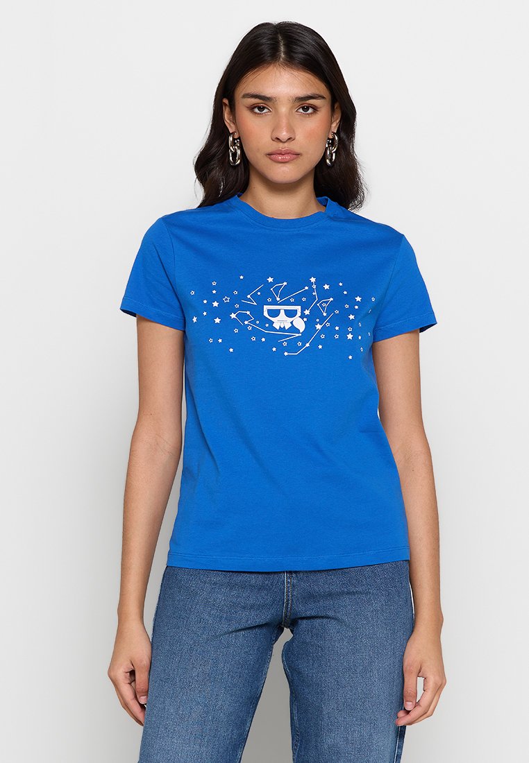 Elevate your casual look with this stylish Karl Lagerfeld graphic print t-shirt. Perfect for the Spring/Summer season, this blue tee exudes effortless chic. Made for the modern woman with a love for fashion, this t-shirt is a must-have addition to your wardrobe. Stay on-trend and comfortable in this versatile piece.