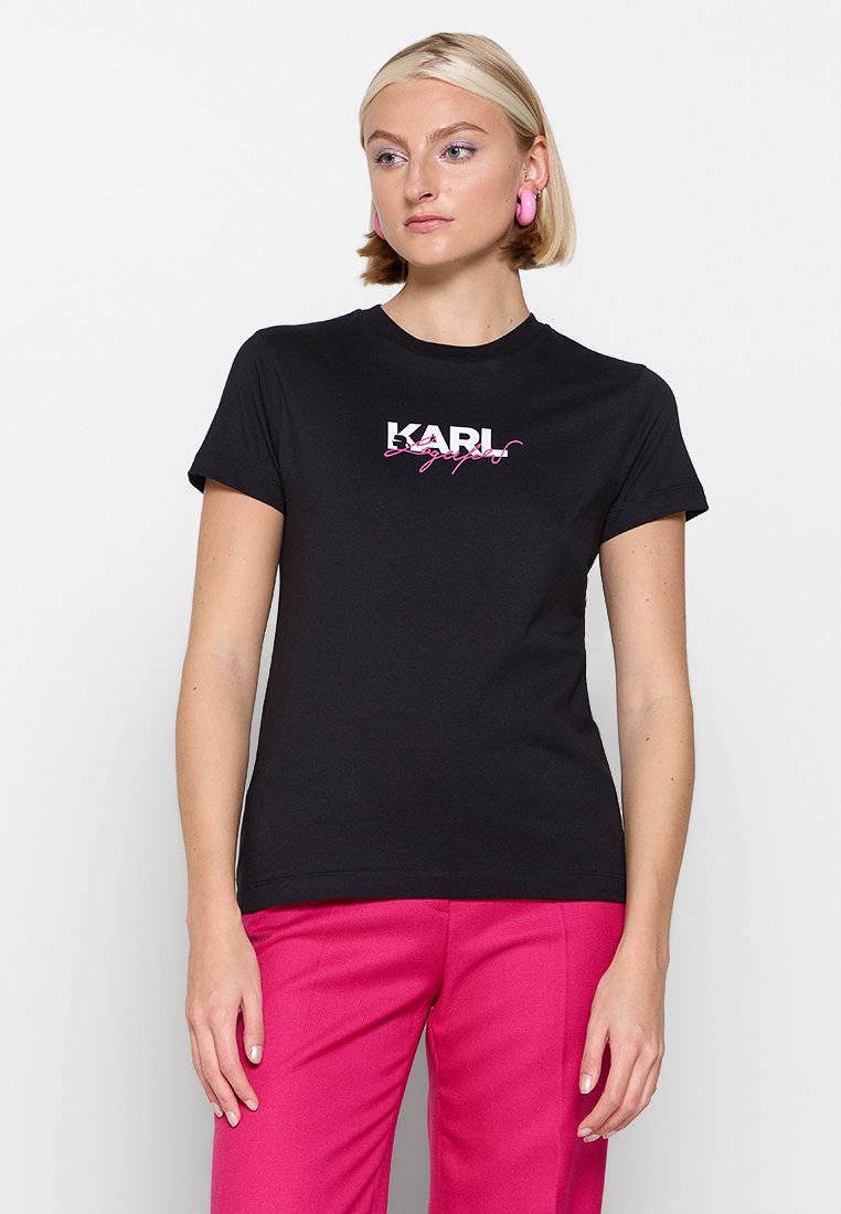 Stay effortlessly chic in this Karl Lagerfeld Women's Casual T-Shirt for the Spring/Summer season. Designed in classic black, this tee features a stylish print that adds a touch of flair to any outfit. Perfect for pairing with jeans or shorts, it's the must-have addition to your casual wardrobe. Elevate your style with this versatile t-shirt.