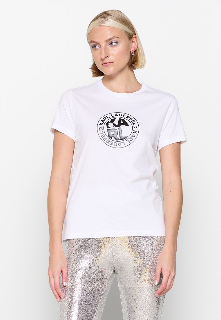 Stay effortlessly chic in this Karl Lagerfeld Women's Casual Style T-shirt for the Spring/Summer season. Crafted in a crisp white color, this tee features a stylish print that adds a touch of flair to any outfit. Perfect for a relaxed yet fashionable look on sunny days.