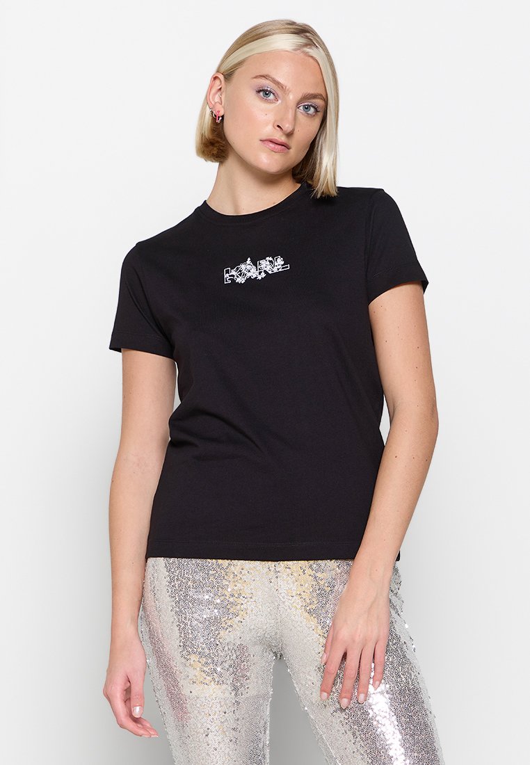 Stay effortlessly chic in this Karl Lagerfeld Women's Casual T-Shirt for the Spring/Summer season. Designed in classic black, this tee features a stylish print that adds a touch of flair to any outfit. Perfect for pairing with jeans or shorts, it's the must-have addition to your casual wardrobe. Elevate your style with this versatile t-shirt.
