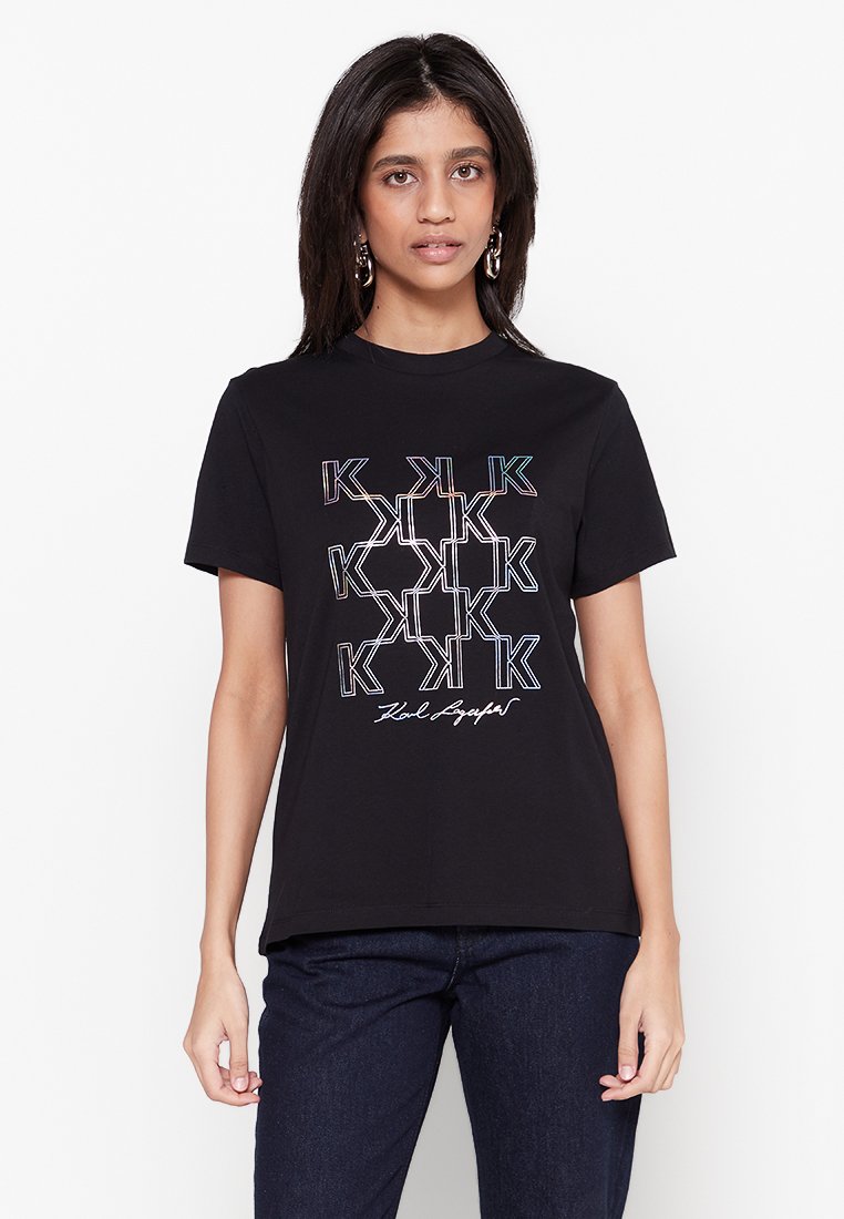Stay effortlessly chic in this Karl Lagerfeld Women's Casual T-Shirt for the Spring/Summer season. Designed in classic black, this tee features a stylish print that adds a touch of flair to any outfit. Perfect for pairing with jeans or shorts, it's the must-have addition to your casual wardrobe. Elevate your style with this versatile t-shirt.