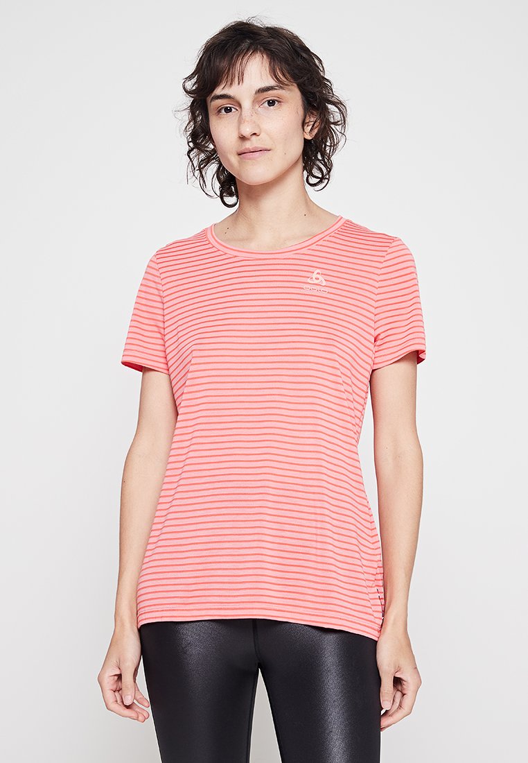 Stay cool and stylish this Spring/Summer with the Odlo Casual Women's T-shirt in vibrant Orange. This trendy shirt features a unique print, perfect for adding a pop of color to your wardrobe. Made from high-quality materials, it is ideal for everyday wear and will keep you comfortable all day long. Upgrade your casual look with this must-have piece from Odlo.