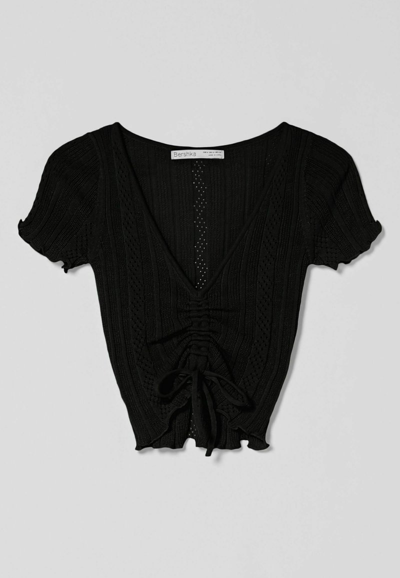 This black Bershka T-shirt for Women is perfect for the Spring/Summer season. Its casual style and comfortable fit make it a must-have for every wardrobe. Featuring a trendy print, this shirt effortlessly adds a touch of chic to any outfit. Upgrade your casual look with this stylish tee.
