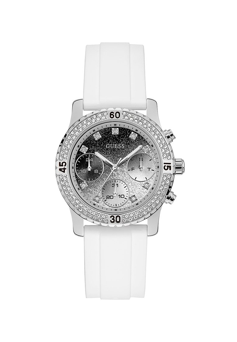 Introducing the Guess Women's Casual/Elegant White Watch, perfect for the Spring/Summer season. This stylish timepiece combines a casual look with elegant details, making it versatile for any occasion. With its crisp white color and sleek design, this watch is a must-have accessory for your wardrobe. Stay on-trend and on-time with the Guess Women's White Watch.