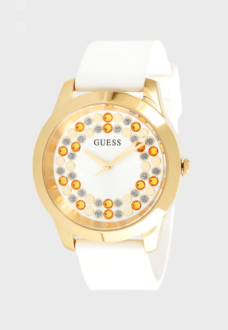Introducing the Guess Women's Casual/Elegant White Watch, perfect for the Spring/Summer season. This stylish timepiece combines a casual look with elegant details, making it versatile for any occasion. With its crisp white color and sleek design, this watch is a must-have accessory for your wardrobe. Stay on-trend and on-time with the Guess Women's White Watch.