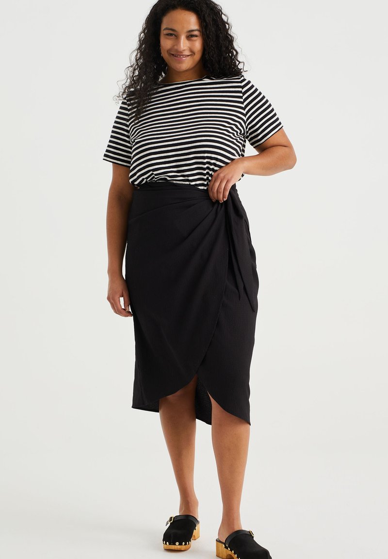 Stay stylish and chic this Spring/Summer with this black wrap skirt from WE Fashion. Perfect for any casual or elegant occasion, this versatile piece adds a touch of sophistication to any outfit. Its flattering fit and timeless color make it a must-have for any woman's wardrobe. Upgrade your look with this sleek and modern skirt.