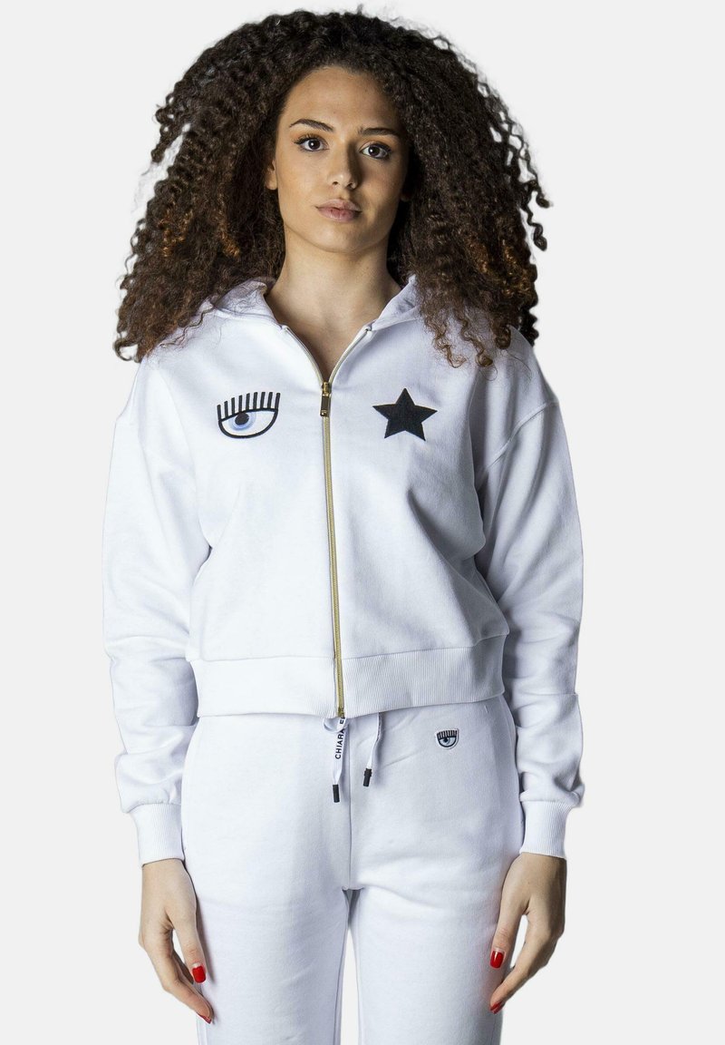 Stay cozy and stylish this fall/winter with the CHIARA FERRAGNI Casual Hoodie for Women. This elegant white zip-up hoodie is perfect for chilly days and nights. Pair it with your favorite jeans or leggings for a chic and comfortable look. Perfect for adding a touch of luxury to your everyday wardrobe.