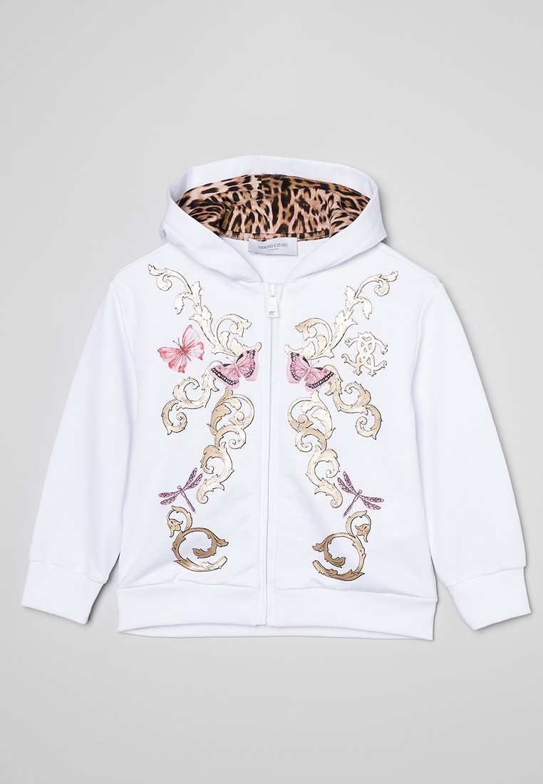 Stay warm and stylish this Autumn/Winter with the Roberto Cavalli Junior Casual Hoodie for Women in sleek White. This trendy zip-up hoodie is perfect for layering over your favorite outfits. Made with high-quality materials and featuring the iconic Roberto Cavalli logo, this hoodie is a must-have addition to your wardrobe. Stay cozy and chic with this fashionable piece from Roberto Cavalli Junior.