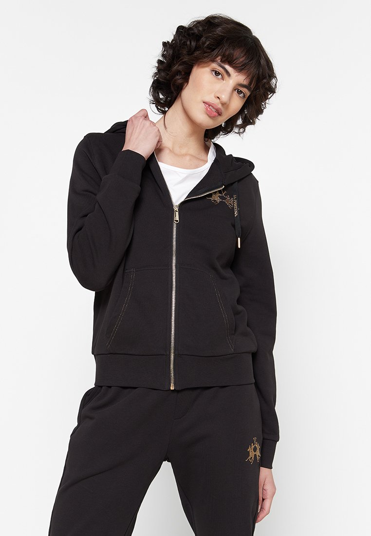 Stay cozy and chic this Autumn/Winter season with the LA MARTINA Casual Style Women's Hoodie in classic Black. This zip-up hoodie is perfect for layering and adding a touch of effortless style to any outfit. Whether you're running errands or staying in, this versatile hoodie is a must-have for your wardrobe. Feel comfortable and fashionable in this stylish LA MARTINA felpa con zip.