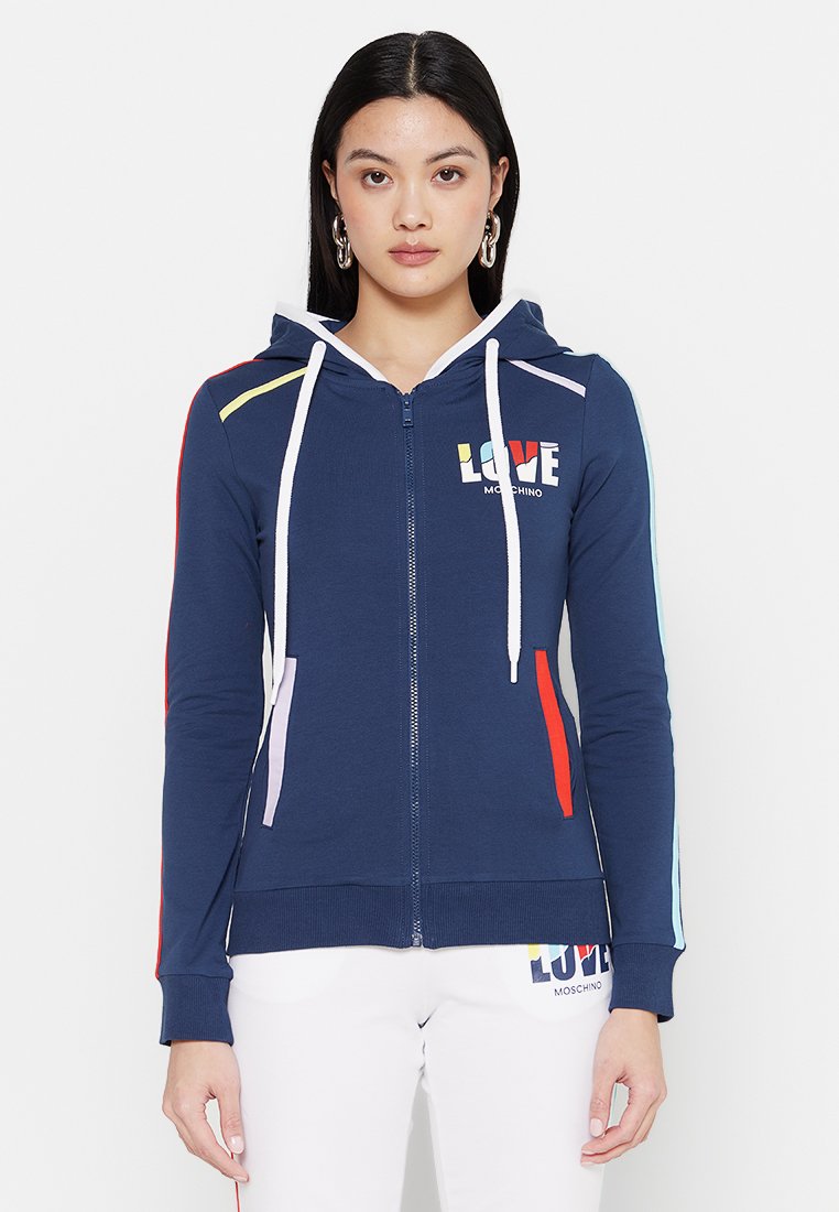 Stay cozy and stylish this season with the Love Moschino Casual Hoodie for Women. In a vibrant Blue color, this zip-up hoodie is perfect for Autumn/Winter weather. Made for comfort and fashion, this felpa con zip is a must-have addition to your wardrobe. Upgrade your casual look with this trendy Love Moschino hoodie.